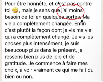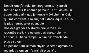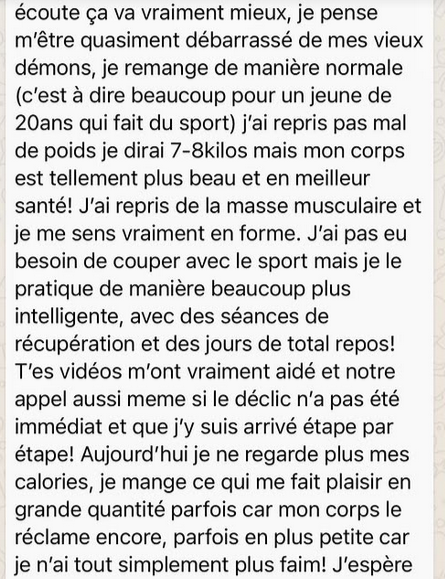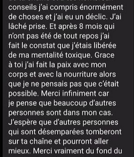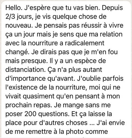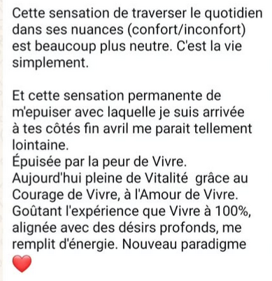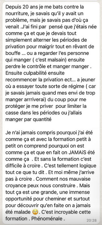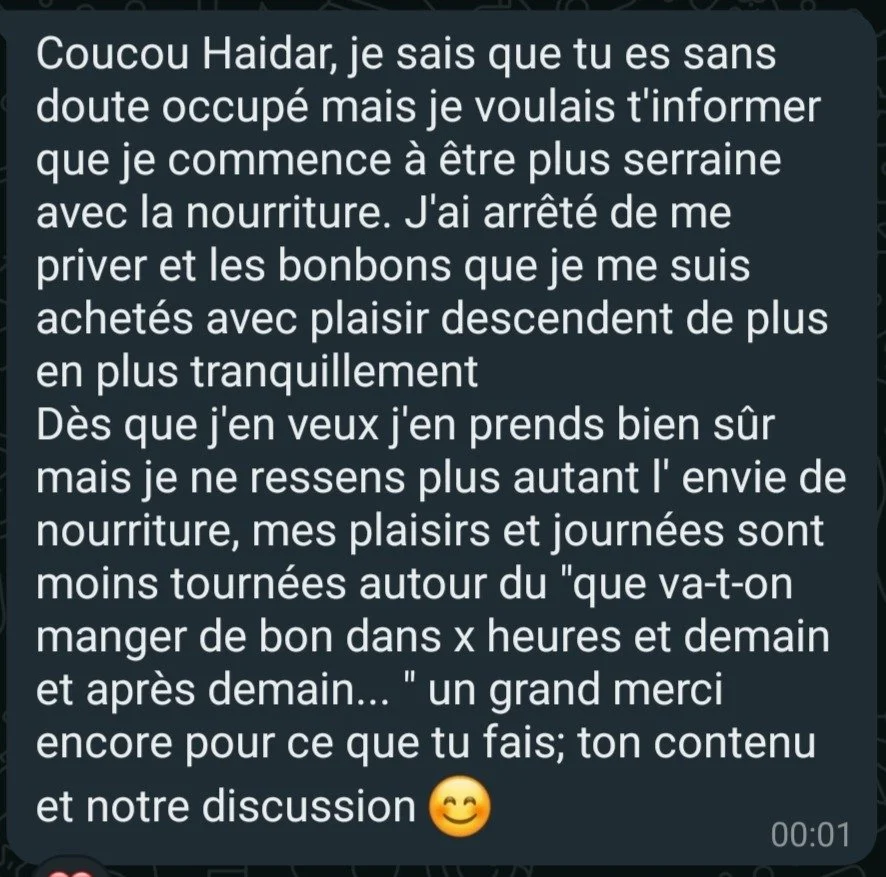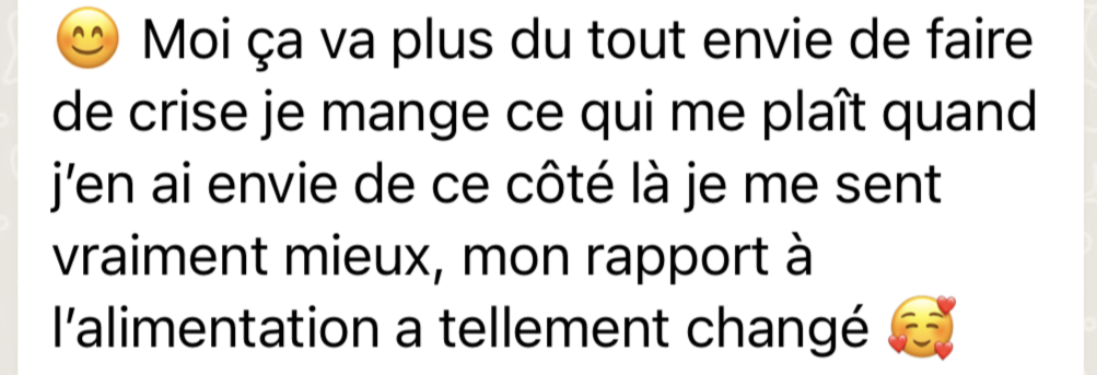 Ensuite, les choses se mettent en place progressivement, sous forme de boucles d’intégration. Semaine après semaine, la nourriture et le corps perdent leur centralité. Et c’est là que le vrai travail commence : aller au fond, vers les vraies questions, vers la racine de ce qui t’enfermait. Parce que la nourriture et le corps n’étaient qu’un symptôme.