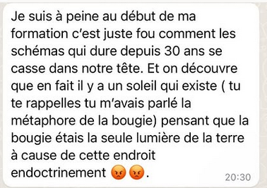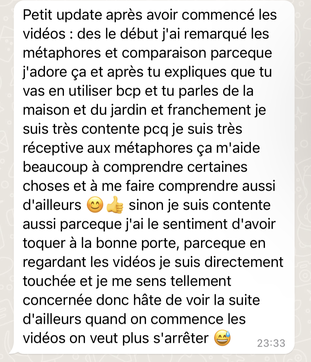 Le suivi WhatsApp est là pour une chose : te garantir que tu ne seras jamais laissé(e) seul(e). Si tu n’as pas trouvé ce dont tu avais besoin dans les trois premiers piliers, tu as toujours cet espace privilégié pour déposer tes questions, tes blocages ou simplement ce que tu vis.