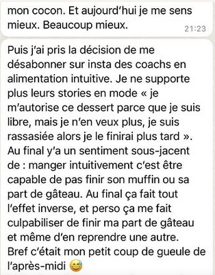 Et surtout, ce n’est pas une question de chance ou de volonté : c’est mécanique. Quand tu arrêtes de lutter contre ton corps, quand tu relâches la restriction et que tu apprends à écouter tes besoins et tes limites, ton système nerveux et ton métabolisme se réorganisent. Peu à peu, la compulsion perd sa raison d’être.