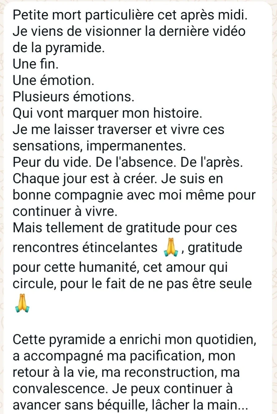 La Pyramide est conçue pour s’adapter à ta réalité : tu avances à ton rythme, selon tes disponibilités. Et les centaines de personnes qui ont déjà traversé ce processus n’étaient pas des gens désœuvrés : elles avaient des familles, des carrières, des vies bien pleines.